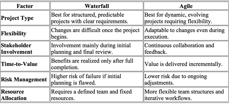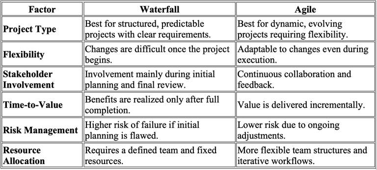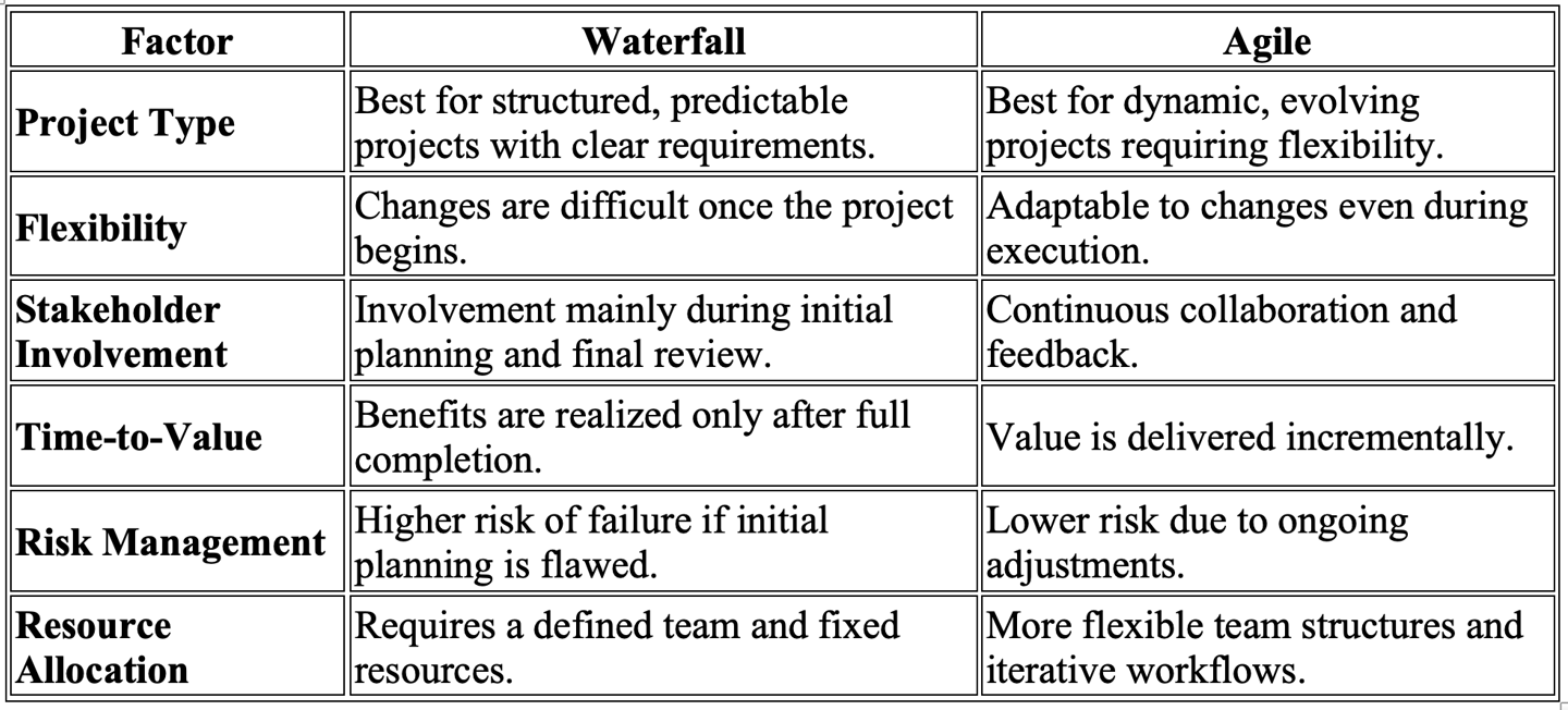 A multinational corporation needed to migrate its payroll system to a new platform. Given the high-stakes nature of payroll processing, a Waterfall approach was used to ensure compliance, accuracy, and minimal disruption.